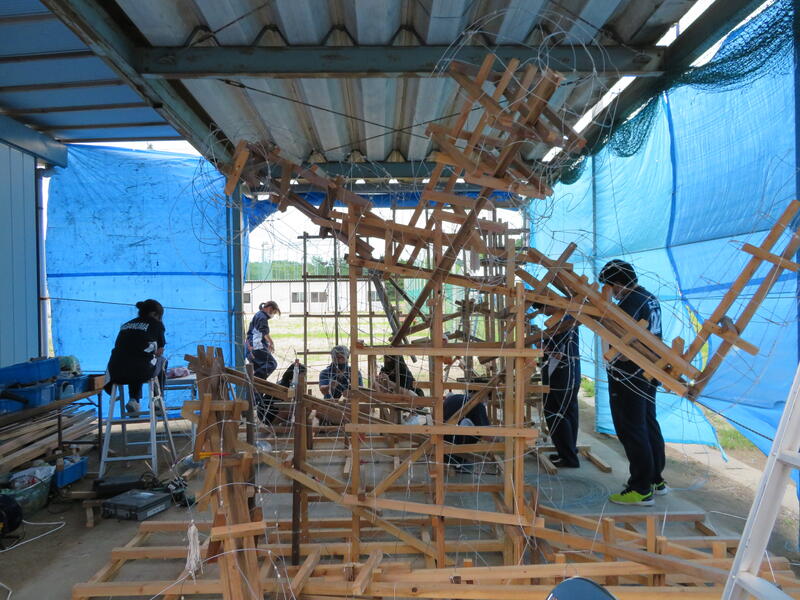 少しずつの細かい作業の積み重ねが基礎となって最後に長高ねぶたが完成します。まだ内部の作業なので、見栄えはよくありませんが、見えない所をしっかりしないと最後に素晴らしい「長高ねぶた」の完成には至りません。進捗は遅れることもありますがみんなの力で順調に進むように協力し合っております。