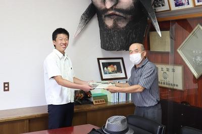 8月20日(木)、長沼高校元PTA会長の佐藤善衛さんが来校されました。「8月18日(火)に、いなくなった飼い犬を長高生が保護してくれた、そのお礼に伺った」とのことでした。その「長高生」は3年B組の伊藤柊哉君。
