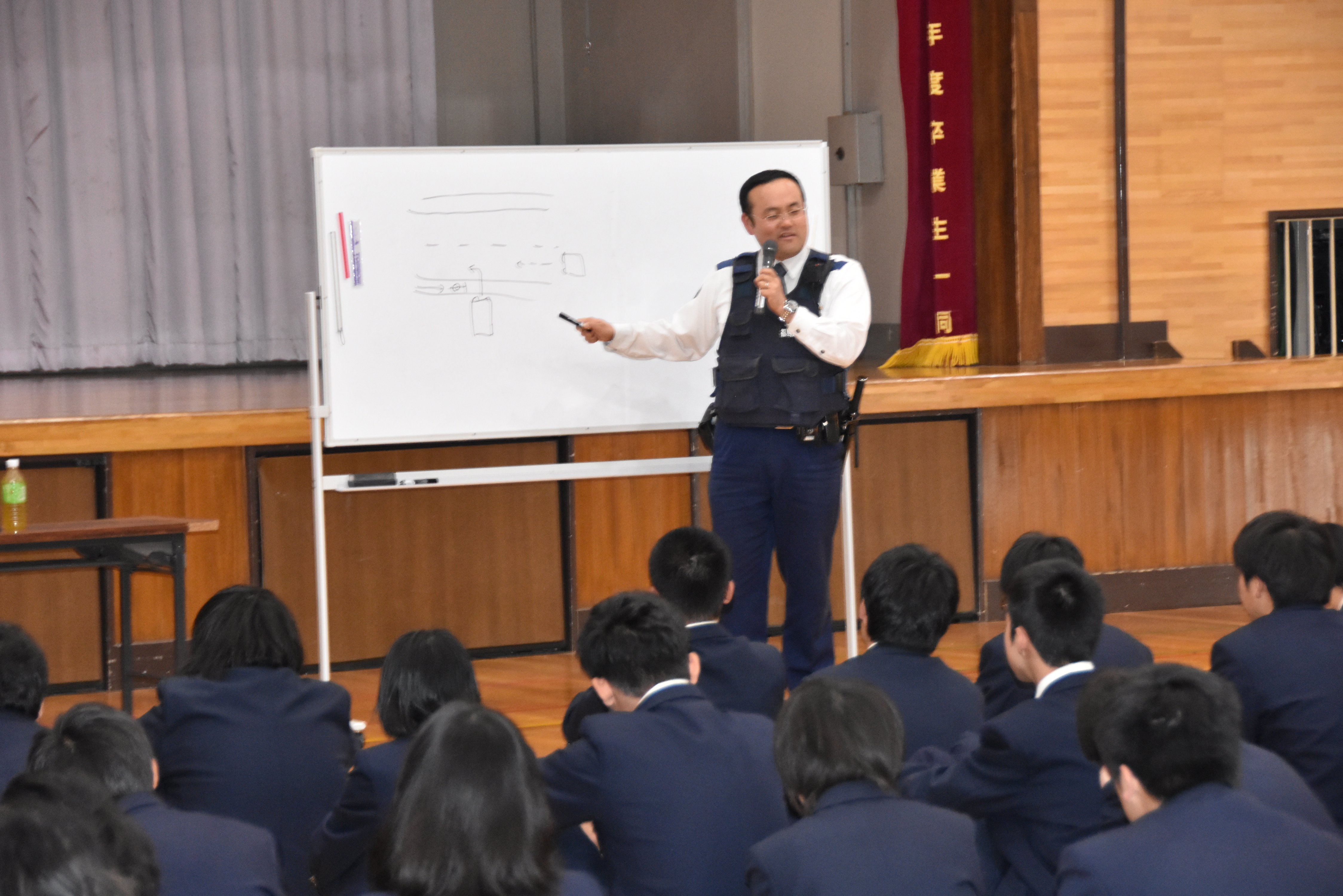 須賀川警察署長沼駐在所の寒河江巡査部長をお招きし、交通安全教室が行われました。講演の最後には質疑応答の時間が設けられ、「片耳だけイヤホンを付けて自転車を運転するのはOKか」「自転車の法定速度はどれぐらいか」といった質問が寄せられました。